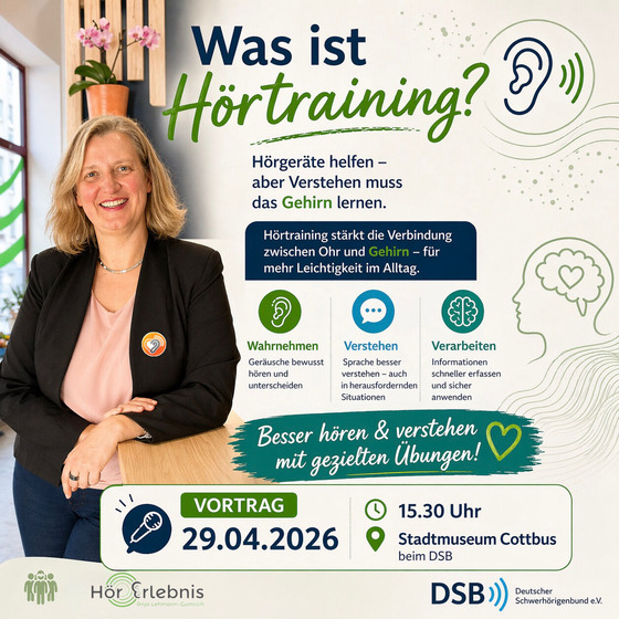 Am 29.04. lädt Anja Lehmann-Gumlich zusammen mit dem DSB - dem Deutschen Schwerhörigen Bund zum Vortrag über Hörtraining ein. Kommen Sie gerne ab 15:30 in das Stadtmuseum Cottbus. Der Eintritt ist frei. Wir freuen uns auf Sie.